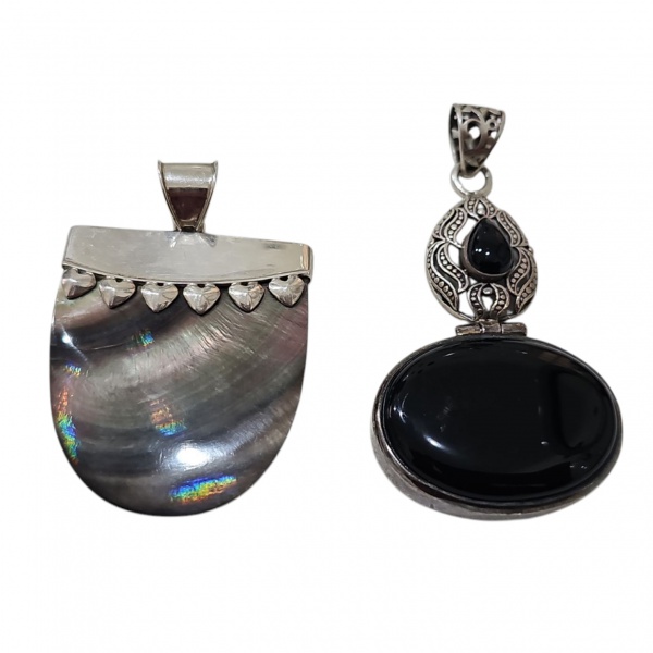• Dois pedantifes castroados em prata ambos contrastados 925, um com madrepérola e outro com ônix, 8 x 4 e 5 x 4 cm. 48, 4 g. bruto,