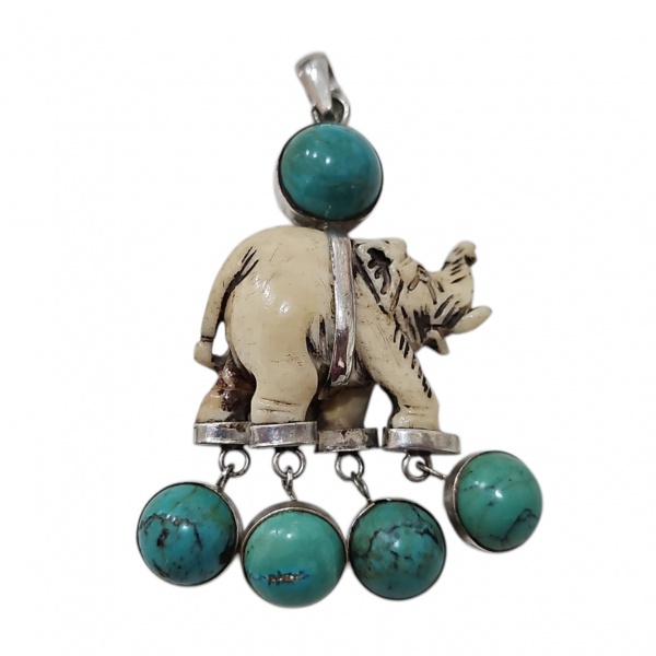 • Pedantife em prata, marfim e turquesas representando elefante, 7 x 4 -  33,4 g. bruto. ( as presas e tromba estão com as ponteiras quebradas).