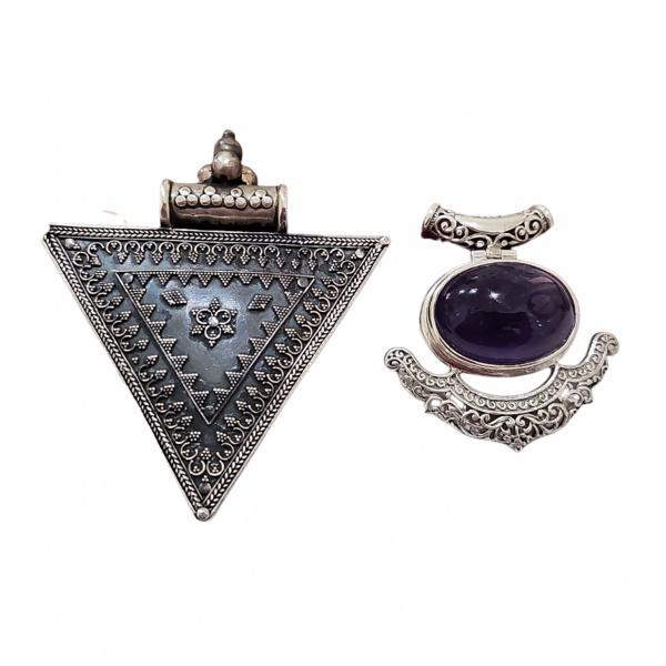 • Dois pedantifes em prata contrastas 925, um deles indiano triangular com desenhos simétricos e outro com pedra ametista, 6 x 5 e 9 x 8 cm. 77,6 g. bruto