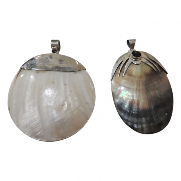 • Dois pedantifes em prata e madrepérolas um deles, com ametista, Diam. 8 e 9 x 6 cm. 94,6 g.