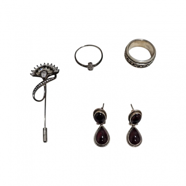 • Quatro peças em prata sendo um prendedor de prata para lenços ou echarpes com pedras brilhantes, 1anel com pedras brilhantes, aro 26,  1 anel maciço chimarrão e repuxado, aro 21 e par de brincos com pedra rubilita, 20,8 g. bruto.