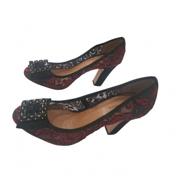 • Par de sapatos femininos nº 37 by Ferruci executado em renda e fivela, semi novo.