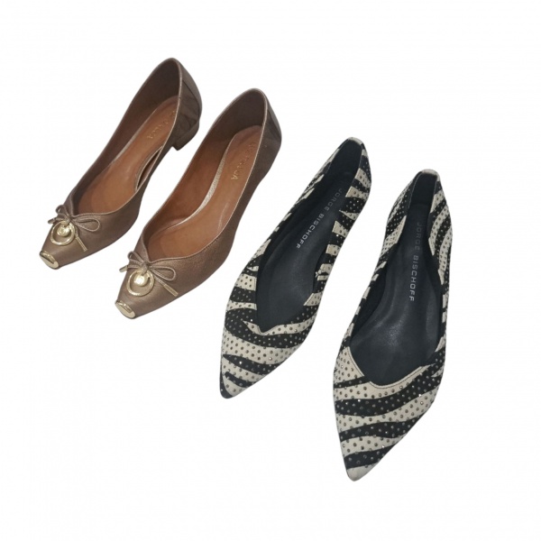 • Dois pares de sapatos femininos de salto baixo um na cor caramelo nº 37 by Luz da Lua e outro Zebra by Jorge Bischoff nª 36.