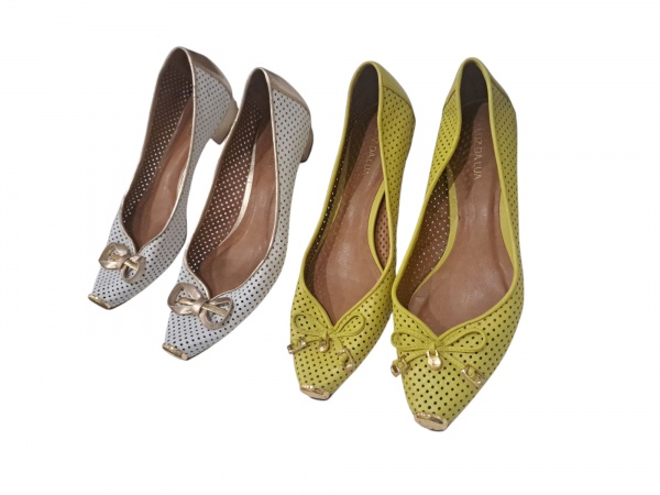• Dois pares de sapatos femininos de salto baixo nº 37 by Luz da Lua executados em couro furadinho nas cores branco  e metalizado e outro amarelo, ambos com ponteira um pouco arranhados.