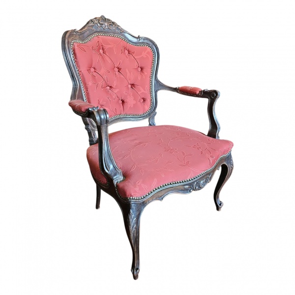 • Poltrona Luiz XV executada em Jacarandá espaldar com medalhão central, o estofamento em capitonet em perfeito estado na tonalidade bordô arrematados por tachas. Com. 60 x  Prof. 48, Alt. 100 cm.