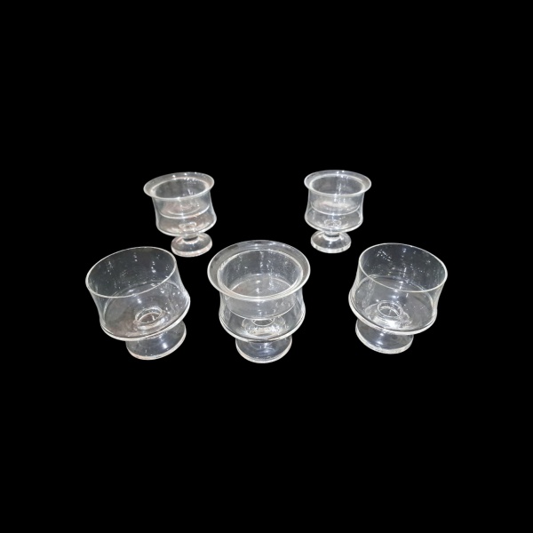 • Cinco taças para cocktail de camarão em cristal translúcido, 3 completos e 2 incompletos, Alt. 11, Diam. 10 cm.