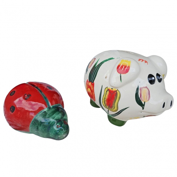 • Dois porta moedas em cerâmica, um representando porquinho e outro joaninha, falta tampa da joaninha. Alt 15, 21, Larg. 14 cm e 14x 10, Alt. 7 cm.
