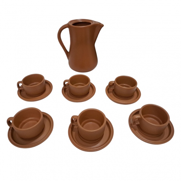 • Seis xícaras para chá/café com pires e uma jarra em cerâmica na cor terracota, Alt. 6, Diam. 8 e 13 cm. Jarra Alt. 22 cm.