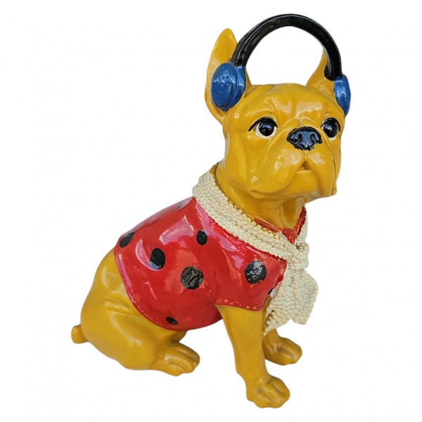 • Escultura representando cachorro em gesso, adornado de cachecol e fone de ouvido. Alt. 20, 18 x 10 cm.