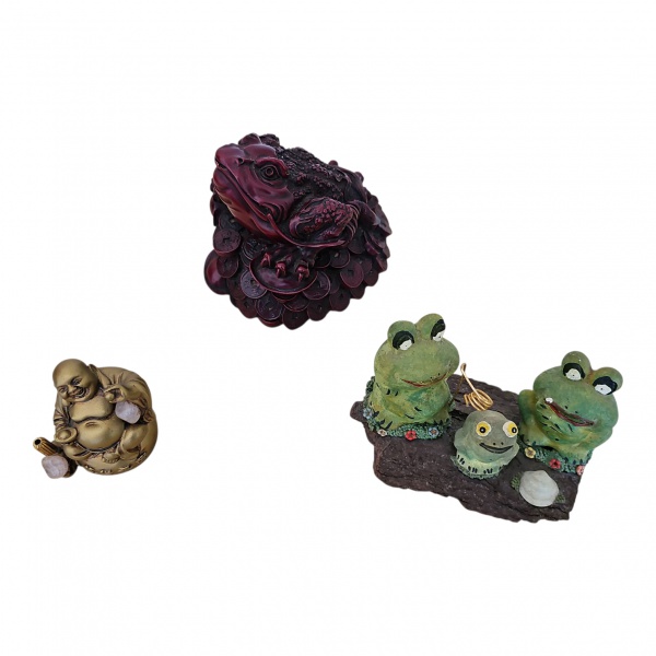 • Sapo Kaerú da fortuna executado em resina grená,  família de sapos e resina e um buda incenseiro com pedras e patinado de ouro antigo, Alt. 14 a 7 cm.