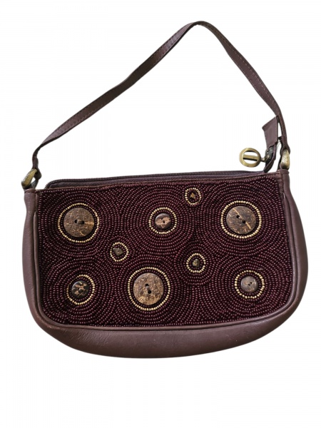 • Bolsa feminina by Luiza Barcelos na cor café com bordados formando mosaico em vidrilhos e botões, 23 x 14 cm.