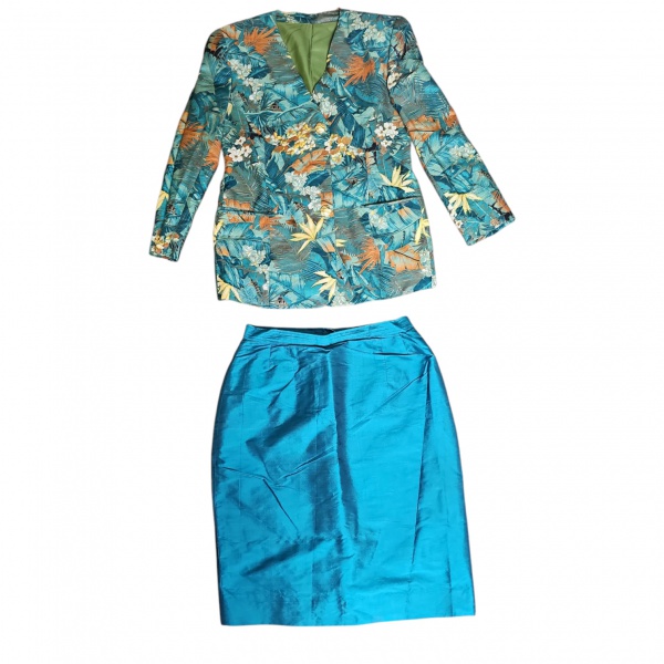 • Tailleur acetinado na cor verde água sendo o blazer estampado, ombro 42, Com. 67, Cintura 43, Com. 60 cm.