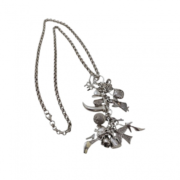 • Cordão e barangandã com vários pingentes representando, coração, anjo, figa e etc. 115,7 g.