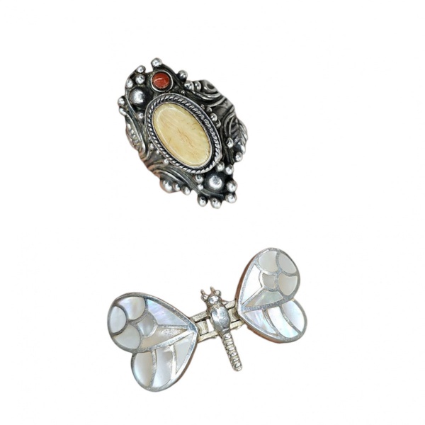 • Dois anéis em prata, um representando libélula com asas articuladas, aro 21, um com marfim aro 18 , 19, 18,7 g. bruto.