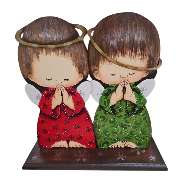 • Escultório em MDF policromado representando anjos apoiados em base retangular, assinado no verso, Nana Fanjalla,40 x 16, Alt. 40 cm.