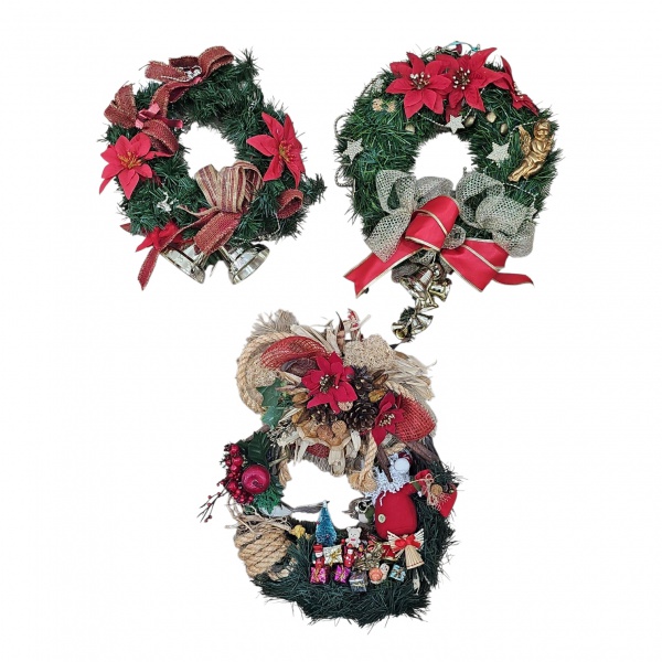 • Três de guirlandas executadas em cipó e enfeites natalinos, 36 x 36 e Diam. 27 e 23 cm.,