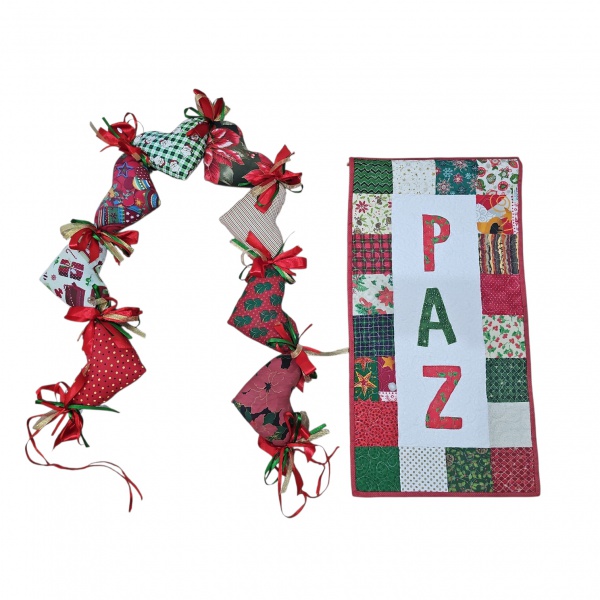 • Dois enfeites Natalinos artesanais, executado em formato de 8 corações, Com. 140 cm e um bandô em Patchwork `Paz`, 36 x 68 cm.