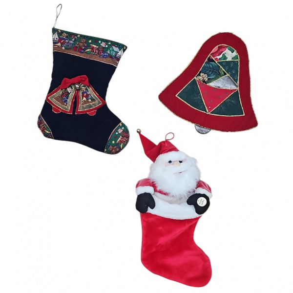 • Três enfeites Natalinos, 2 botas e um coração em tecido, 36 x 30 a  46 x 26 cm.