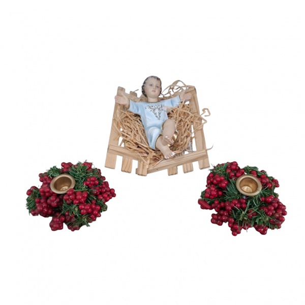 • Menino Jesus executado em gesso policromado na manjedoura de madeira, (Menino Jesus com vários desgastes na policromia) e par de  bocheches Natalinas,