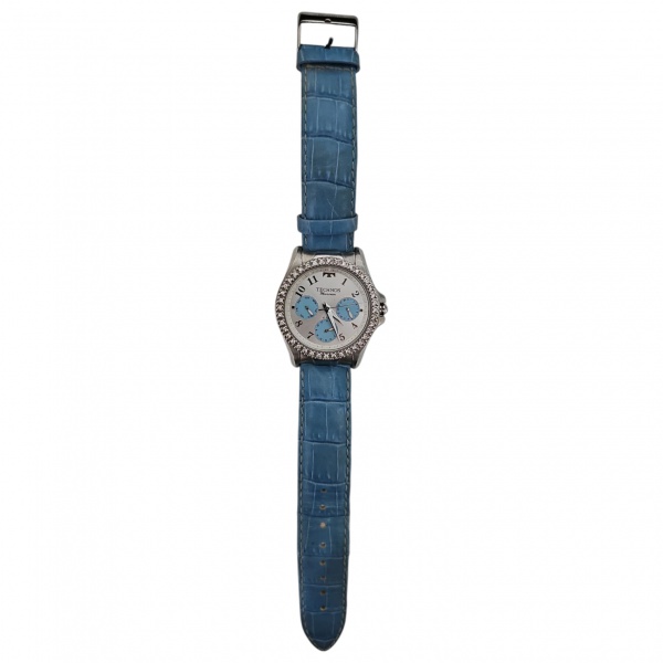 • Relógio feminino Technos, 6P29 analógico com bordas cravejada de pedras brilhantes, pulseira  de couro azul, Diam. 3,5, Com. 22 cm.