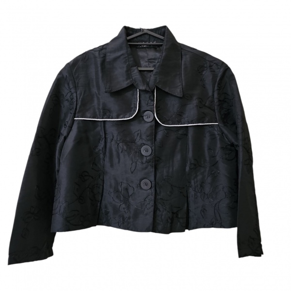 • Casaquinho Tam. M. tipo oriental na cor preta com bordados e acabamentos prateados, Azpex, ombro 40, Com. 40 cm.