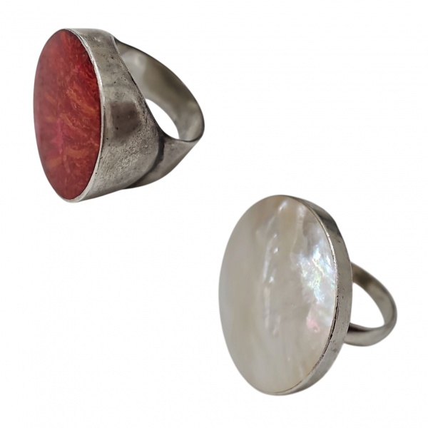 • Dois anéis femininos de prata contrastados 925 um com madrepérola aro 26 e outro com coral aro 22. 27 g.
