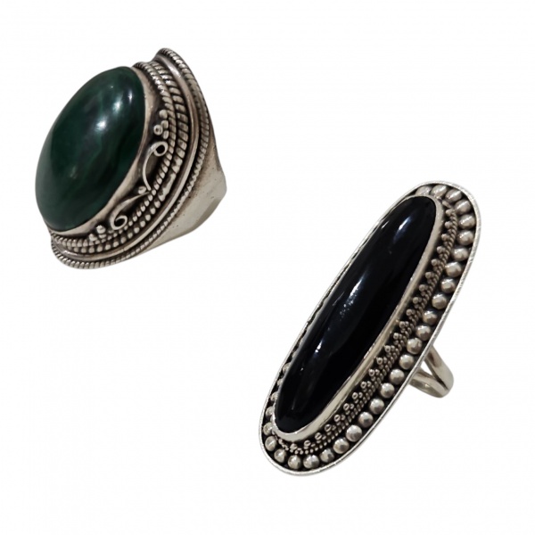 • Dois anéis femininos em prata sendo um com pedra quartzo contrastada 925, aro 21 e outro ônix aro 28, 37,7 g. bruto.