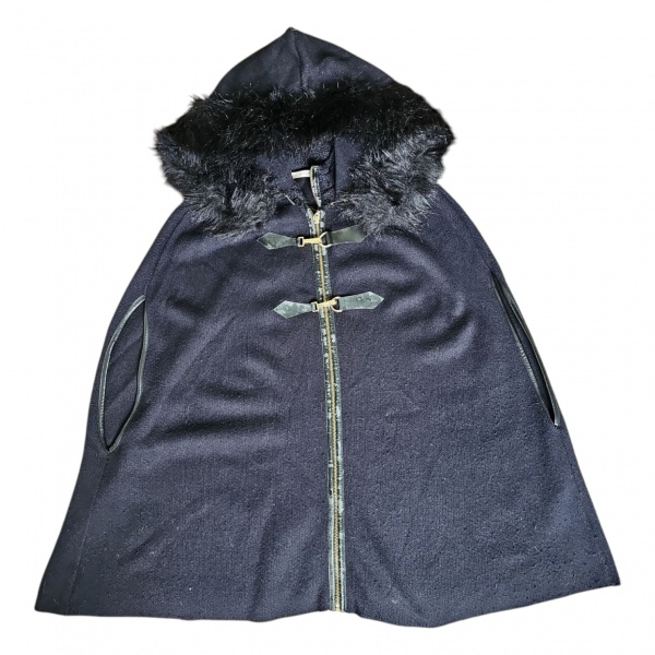 • Pelerine by Carmim,  na cor preta com capuz, em pelo sintético, a parte de couríssimo com marcas de uso, 80% acrílico 20% poliéster, Com. 72 cm.