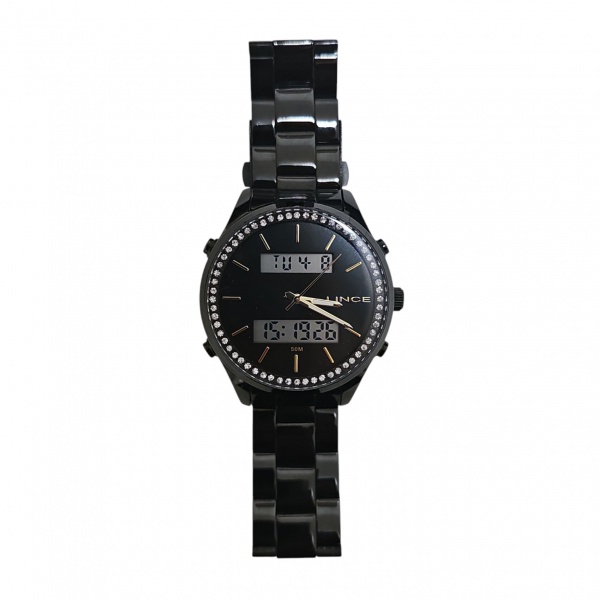• Relógio de pulso feminino analógico Lince Lan 4591L, 50 m. prof. na cor preta com  bordas com pedras  brilhantes. Diam. 4, Com. 26 cm.