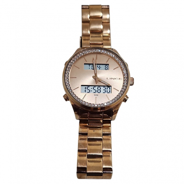 • Relógio de pulso feminino analógico Lince Urban LRG158L40 na cor cobre, cravejado de pedras brilhantes na borda, Diam. 4, Com. 24 cm.