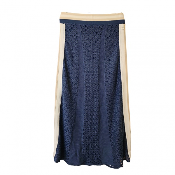 • Saia, Tam. M. em malha by Carmem Steffens sanfonada com listras diagonais nas cores azuis e brancas, cintura 39, Com. 72 cm.