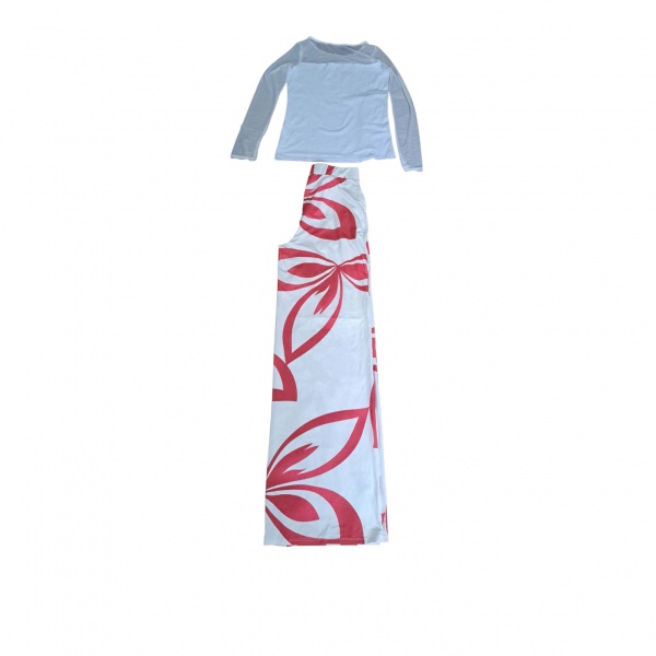 • Uma pantalona estampada em poliéster Tam. G, nas cores branca e vermelha by Renata Motta, nunca foi usada, cintura 33, Com.112 cm. E uma blusa branca em poliéster by Top Moda Tam. M. ombro 33, Com. 63 cm.