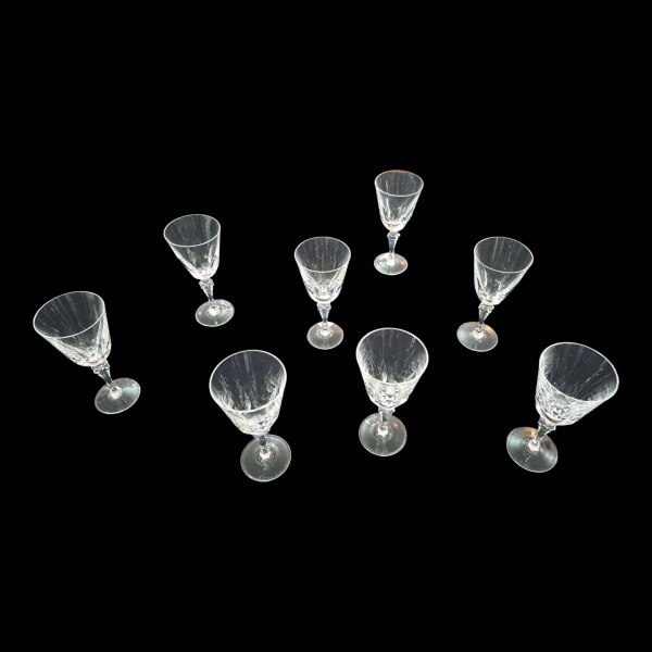 • Oito taças para vinho branco em cristal translúcido, lapidação dedão,  duas com  bicado, 15 x 7 cm.
