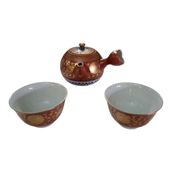 • Bule em  e par de xícaras em porcelana japonesa, decoradas com dourado e azul sobre fundo ocre, uma das xícaras com bicado. Alt. 12, Diam. 11 cm.