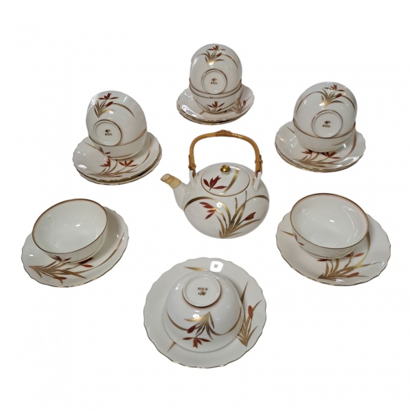 • Bule, dez xícaras, nove pires em porcelana oriental com pinturas douradas e vermelhas sobre fundo creme, bordas douradas, 10 x 12 cm.