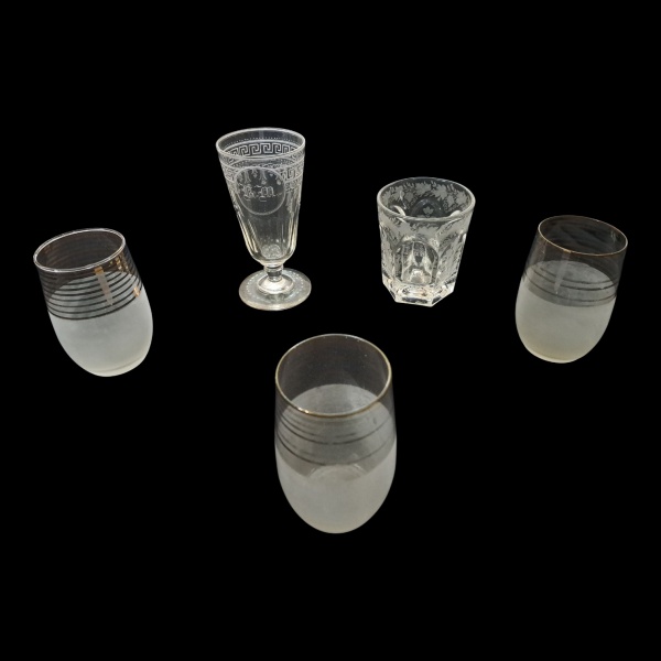• Cinco copos diversos em cristal sendo três com bordas douradas, 1 jateado e uma taça em grega e monografada B.M. 12 x 7 e 17 x 8 cm.