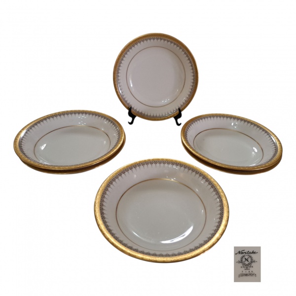 • Seis bowls para sobremesa em porcelana Noritake com bordas douradas sobre fundo branco, Diam. 14 cm.