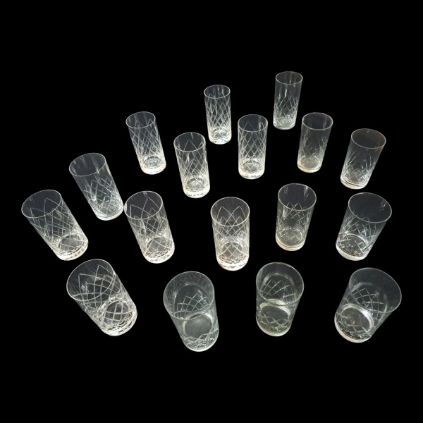 • Dezesseis copos em cristal lapidação losangos sendo 11 para suco 6 para água, um deles bicado, 17 x 7 e 6 para água, 14 x 7 cm.