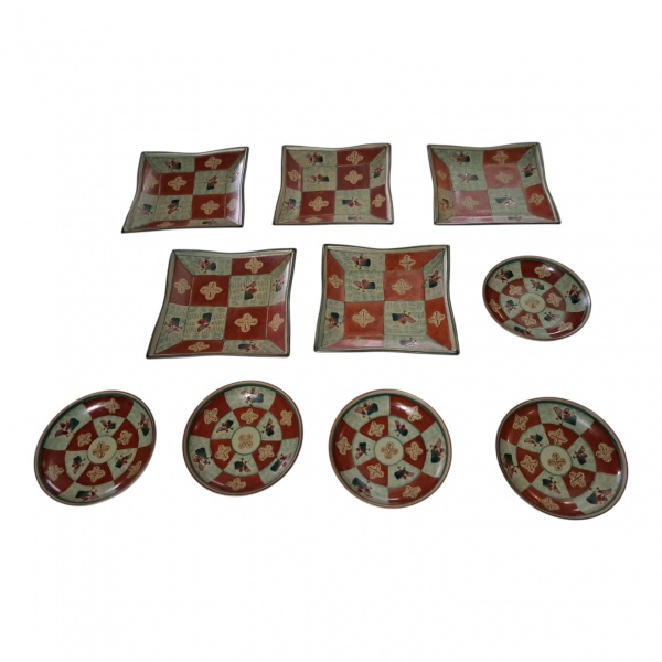 • Cinco travessas e 5 travessinhas para molhos em  cerâmica japonesa decoradas com policromia, 13 x 13 e Diam. 53 cm.