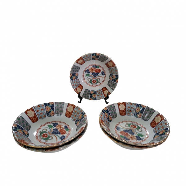 • Cinco  bowls em porcelana oriental descoradas com policromia, bordas babadas com fios dourados,  Diam. 13, Alt. 4 cm.