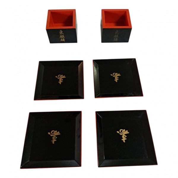 • Quatro pratos e 2 taças par sushi em laca japonesa preta e vermelha com diagramas dourados, 12 x 12 e 8 x 8 cm.