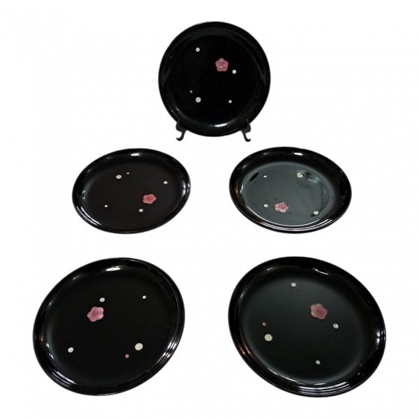 • Cinco pratos em melamina e fundo decorado com flor, Diam. 13 cm.