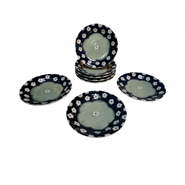 • Oito pratos japoneses para sobremesa em porcelana com pinturas representado flores sobre fundo marinho e centro na cor verde água, Diam.. 16 cm.