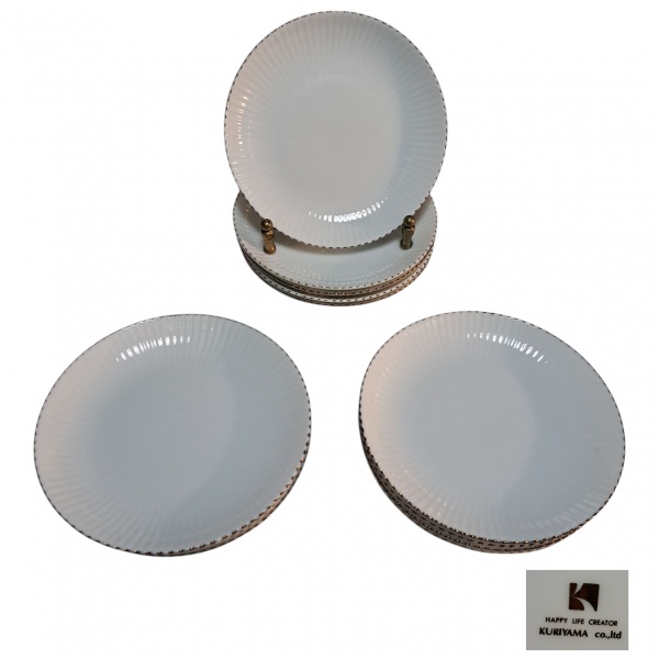 • Doze pratos japoneses para sobremesa em porcelana branca com bordas caneladas e fios dourados by Kuriyama. Co. Diam. 16 cm.