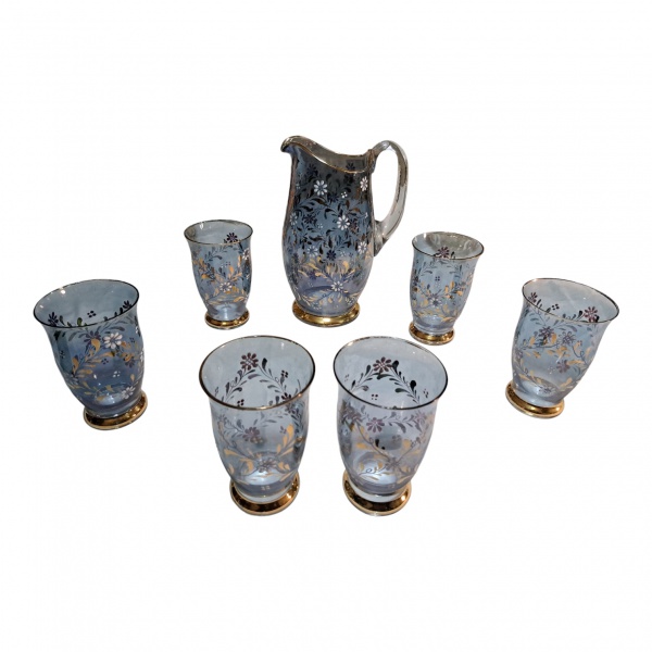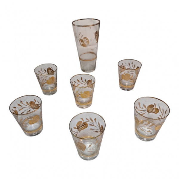 • Refresqueira  e 6 copos anos 50 em cristal translúcido com desenhos de flores e bordas douradas, Alt. 20, Dia. 10 cm. o dourado a Refresqueira com algumas partes do dourado esmaecidos.