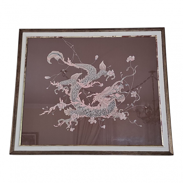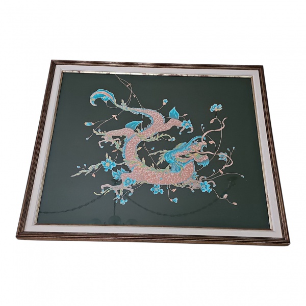 • Pintura oriental sobre tecido representando dragão, 91 x 76 cm.