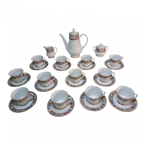 • Guarnição para chá em porcelana japonesa Noritake com decoração de flores sobre fundo branco composto de: 1 bule, 1 cremeira, 1 açucareiro e 12 xícaras com pires. Alt 27, Diam. 17  a Alt. A Diam. 10 cm. Total: 15 peças.