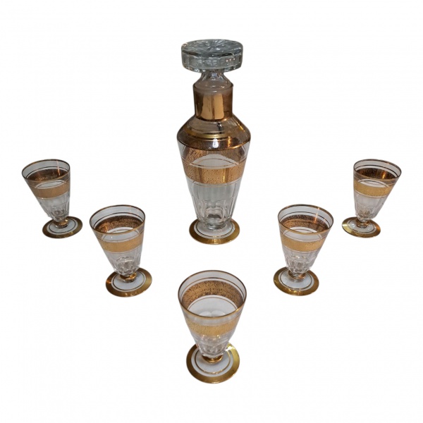 • Licoreira e 5 taças anos 50 em cristal lapidação dourada, a tampa da licoreira é adaptada, Alt. 27, Diam. 11 cm.