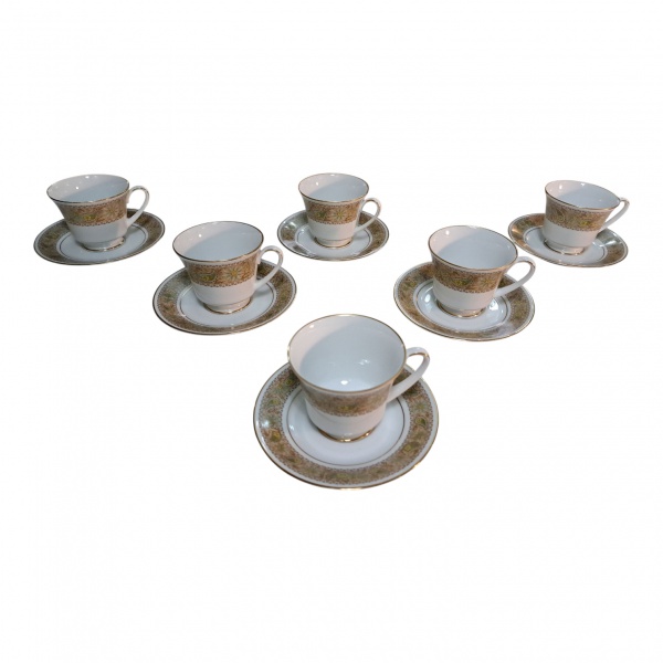 • Seis xícaras para chá com pires em porcelana Noriatakecom bordas decoradas com  singelas flores e dourado, Diam. 9, Alt. 8 cm.