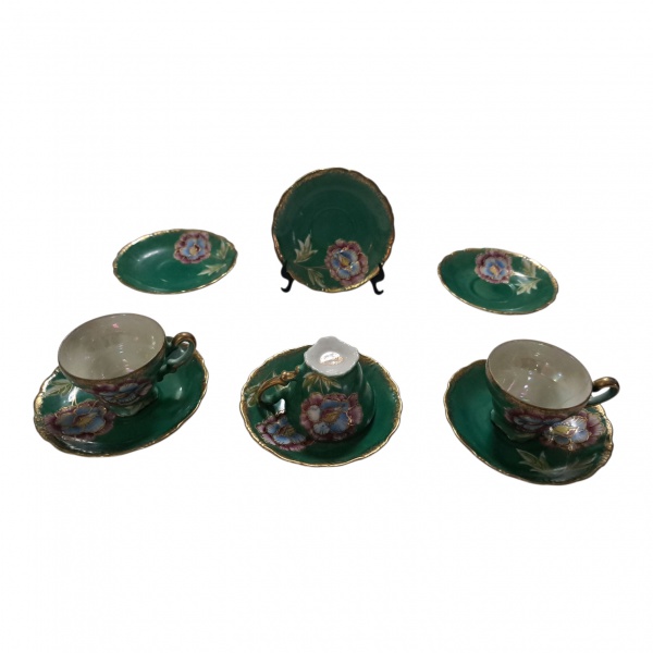 • Três xícaras e 6 pires em porcelana Windsor, pintadas à mão marcados na base, Diam. 6,5, Alt. 5 cm.